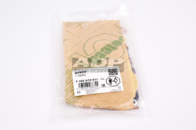 Ремкомплект ТНВД F002A10611 (производитель BOSCH) - Розничная цена 738.75 р., Оптовая цена - по договору. Срок поставки: в наличии и под заказ. Бесплатная доставка по Санкт-Петербургу или до транспортной компании. Автозапчасть по каталогу производителя относится к группам: Системы дизельного впрыска, Дизельные запасные части (традиционные системы). Основные характеристики артикула F 002 A10 611: размеры (149/119/9/) мм., вес - 0.157 кг., объем - 0.16 л.. Фото: F002A10611.